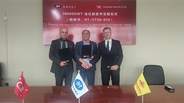 2020年7月9日,公司為德國船東CB建造的38K噸油化船 “CB Pacific”(船體號:HT-CT38-014)成功簽字交船,該船入DNVGL船級社。