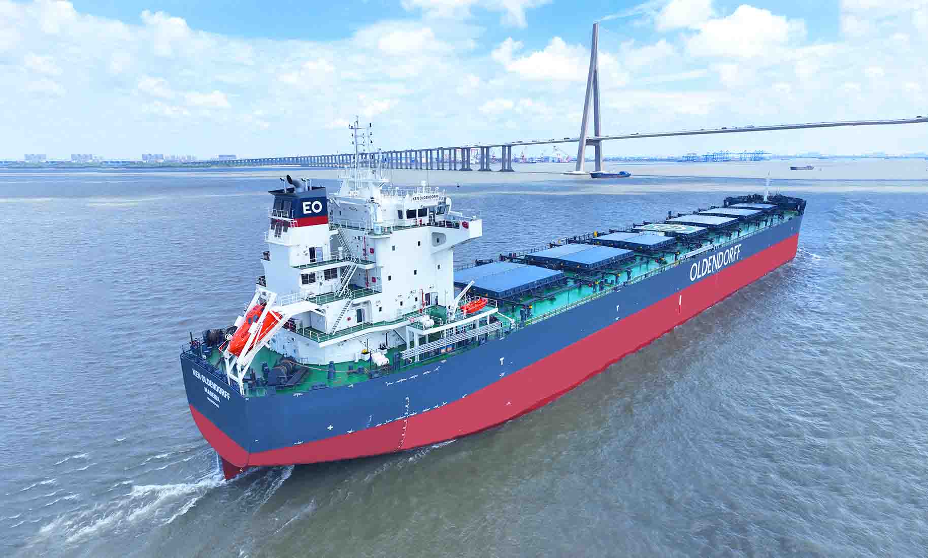 2023年9月5日,在大家的共同見證下,韓通為德國OLDENDORFF船東建造的82000噸散貨輪 “KEN OLDENDORFF”(船體號:HT82-273)順利簽字交付,該船于9月3日在公司碼頭成功舉行了命名儀式。HT82-273是系列船中的第7艘,也是韓通交付給OLDENDORFF的第26艘,屬于目前航運市場主流的散貨船船型,也是公司的拳頭產(chǎn)品之一,入LR船級社。