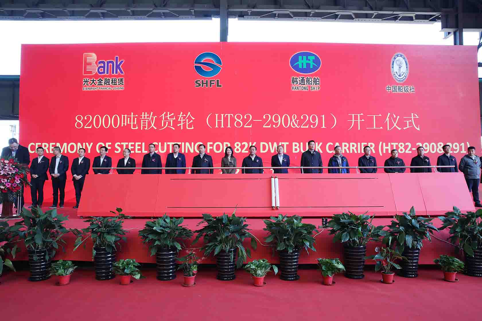 2023年11月17日上午,韓通為山東華宸融資租賃股份有限公司和光大金融租賃股份有限公司聯(lián)合建造的12條散貨輪中首兩艘船(船體號(hào):HT82-290&291)順利開工。