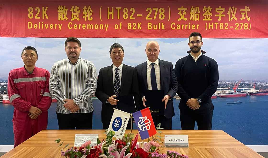 2024年1月4日,韓通為克羅地亞Atlant Kamsarmax II Corporation船東建造的82000噸散貨輪“AP LOVRIJENAC”(船體號(hào):HT82-278)成功簽字交付。